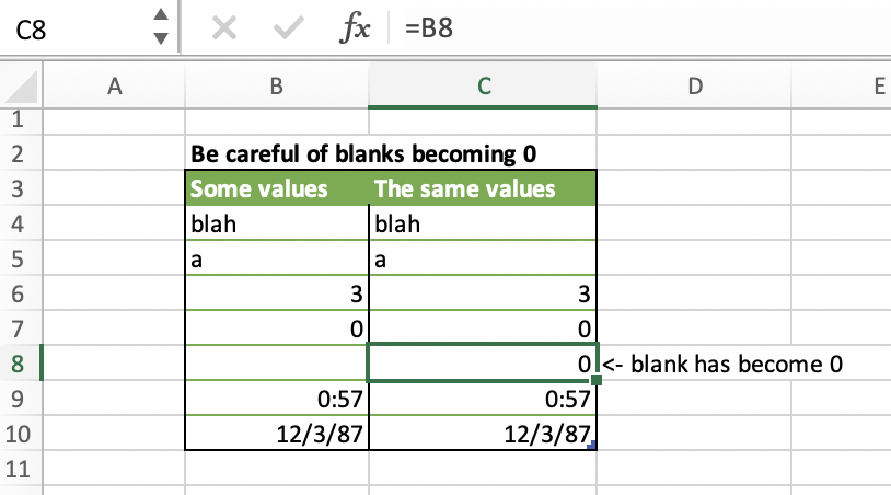 - Referencing the contents of a cell will return the contents of the cell, unless it is blank. A blank cell will turn into a zero. Thus missing data can magically turn into non-missing data in the middle of your analysis. Instead of