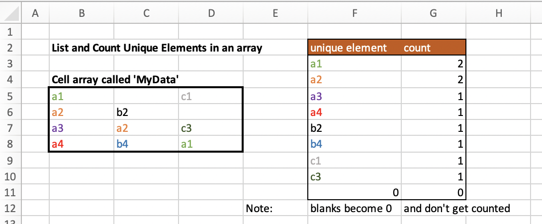 ROW(INDIRECT("1:"&COLUMNS(MyArray)*ROWS(MyArray))). Using the formula=ROW(INDIRECT("1:10"))will give me a cell array of{1;2;3;4;5;6;7;8;9;10}. So to get an iterator to go through all the elements in the array, I useROW(INDIRECT("1:"&COLUMNS(MyArray)*ROWS(MyArray))). Let’s call this iteratorinow. - Indexing the array
